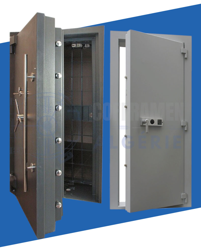 Système de fermeture reste choix du client soit double serrure à clef et combinaison à disque ou bien électronique, soit une serrure decayeux 4 compteurs.